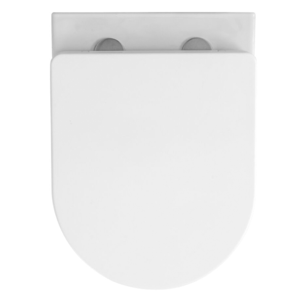Чаша безободкового подвесного унитаза, ультратонкое сиденье для унитаза из дюропласта с функцией плавного закрывания Soft Close, комплект креплений для сиденья, комплект креплений для скрытого монтажа унитаза, гарантийный талон, инструкция