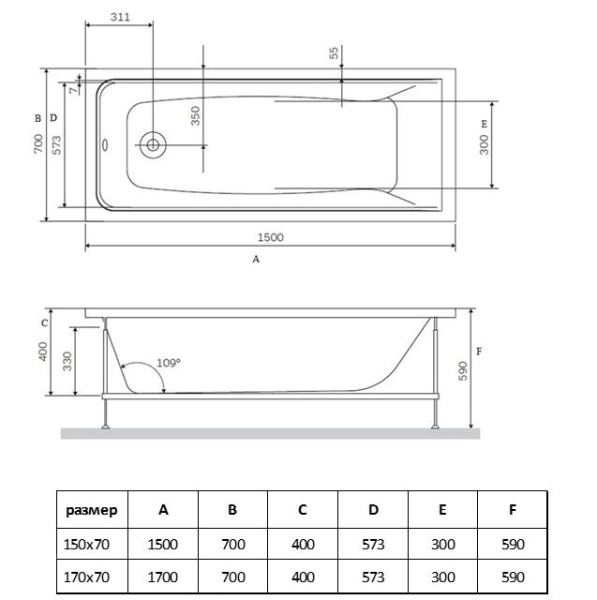 Ванна акриловая Vincea VBT-2G150-FR с каркасом 1500*700*470, пристенная, цвет белый