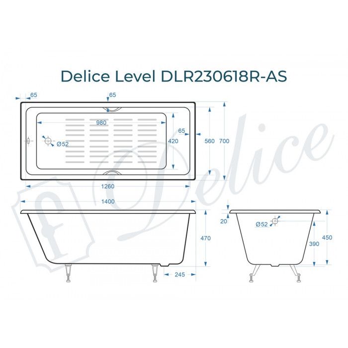 Ванна чугунная Delice Level DLR230618R-AS 140х70 с отверстиями под ручки и антискользящим покрытием