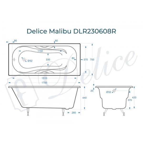 Ванна чугунная Delice Malibu DLR230608R 170x70 с отверстиями под ручки