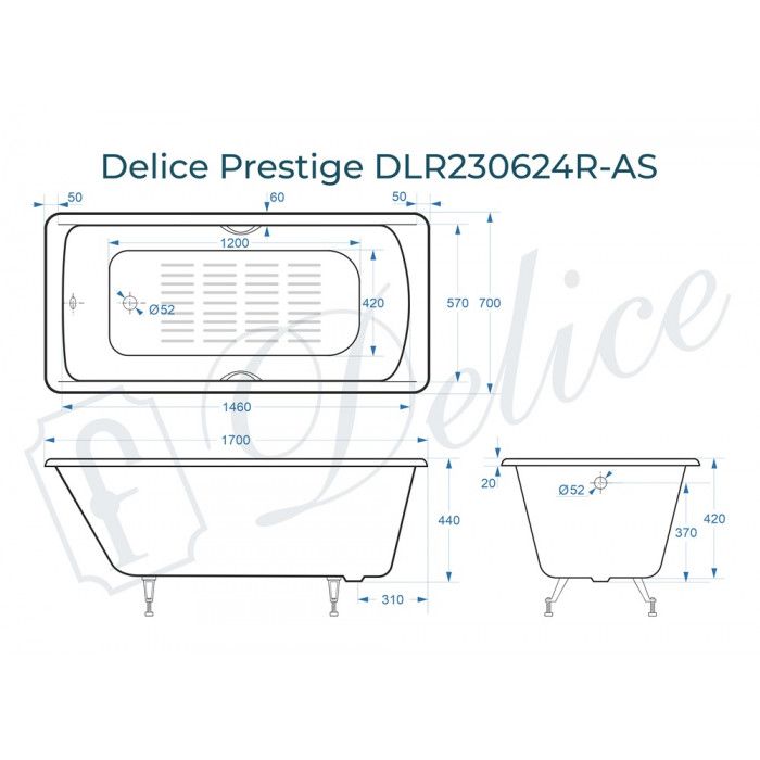 Ванна чугунная Delice Prestige DLR230624R-AS 170х70 с отверстиями под ручки и антискользящим покрытием купить
