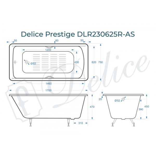 Ванна чугунная Delice Prestige DLR230625R-AS 170х75 с отверстиями под ручки и антискользящим покрытием купить