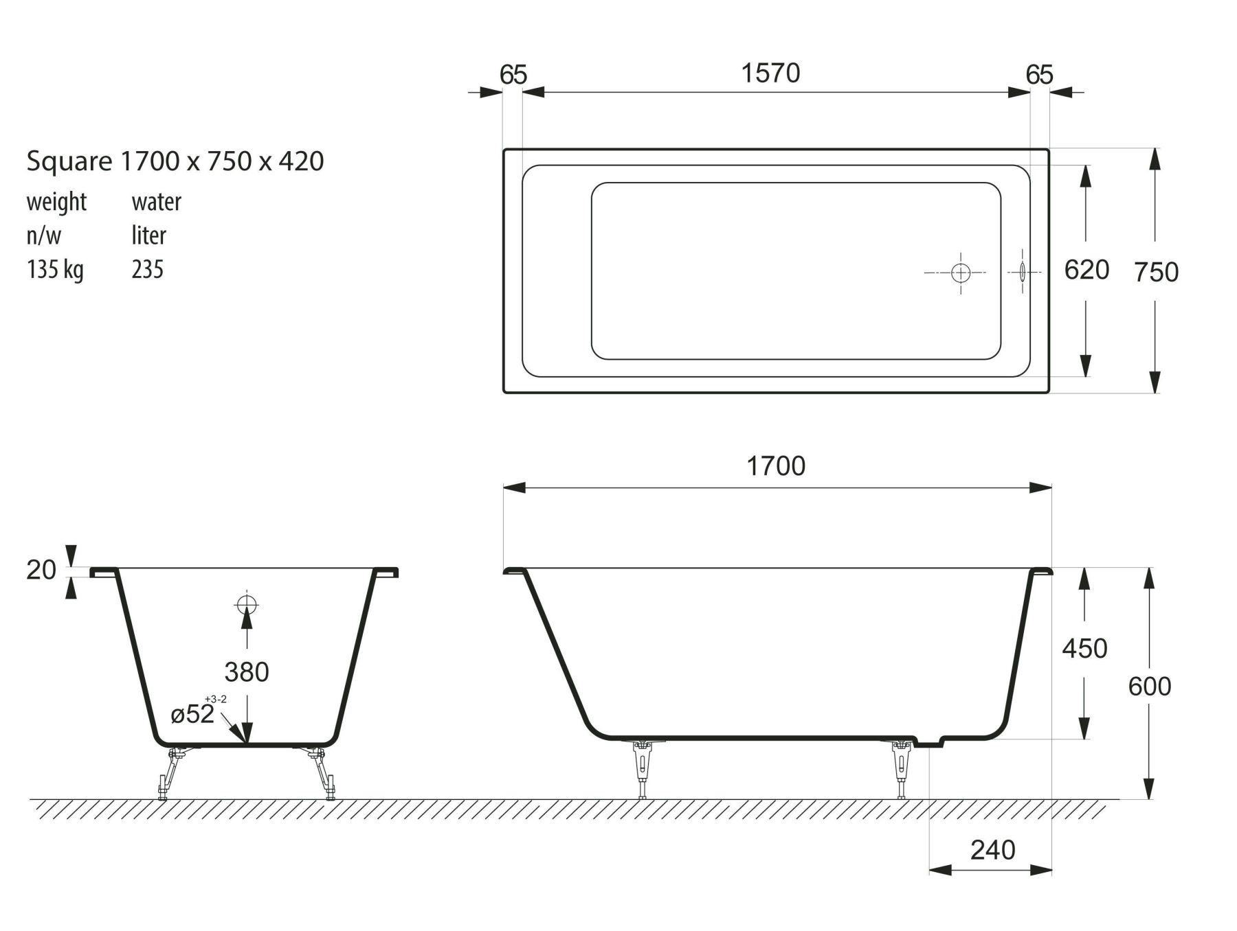 Общие характеристикиРазмер 170х75 Длина 170 см Ширина 75 см Глубина 45 см Высота на ножках 60 см Полезный объём 295 л Вес 135 кг Бренд Vinsent Veron 7 слёв титановой эмали класса 1А Цвет эмали белый Без антискользящего покрытия Диаметр слива Ø5Расположение перелива стандартное