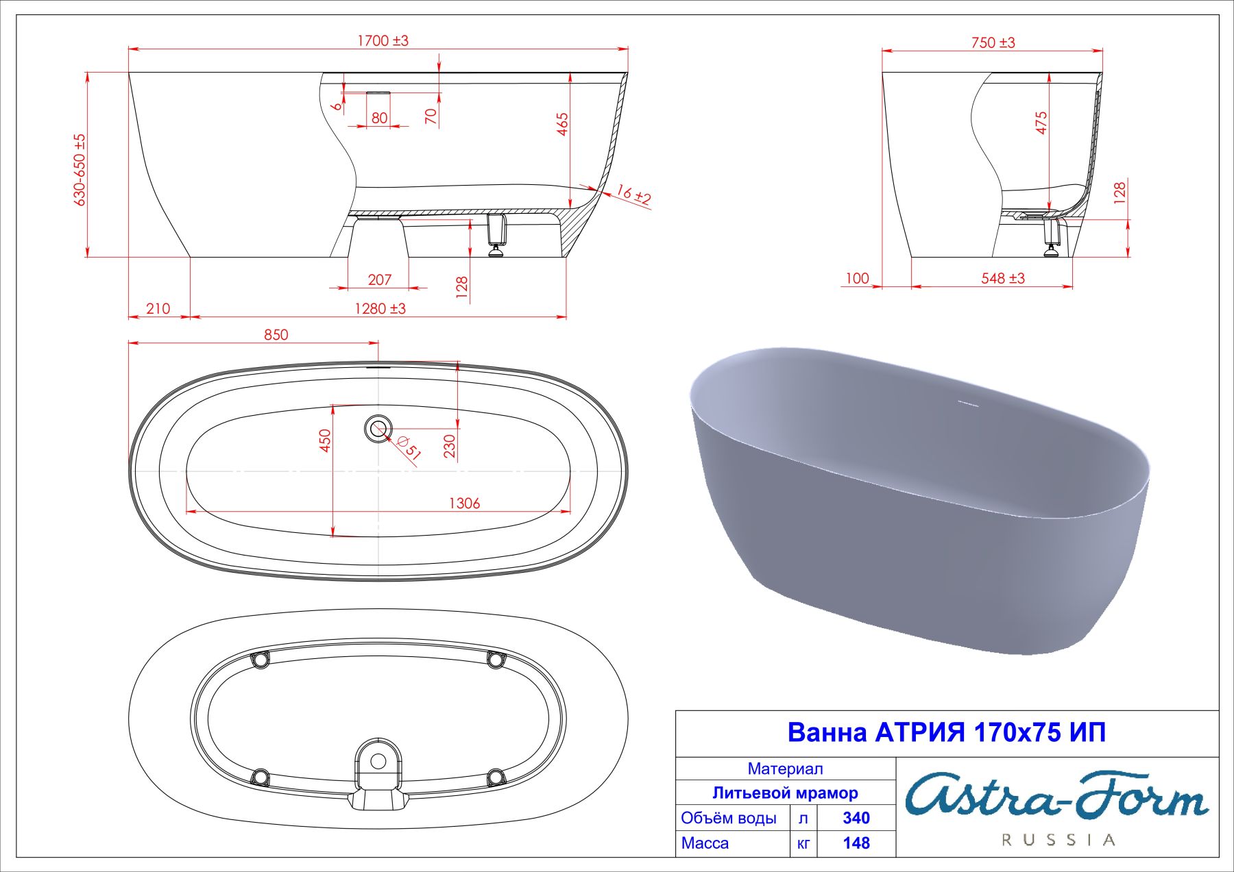 Ванна из искусственного камня Astra-Form Атрия 01010044 170x75 см с интегрированным переливом белый глянец