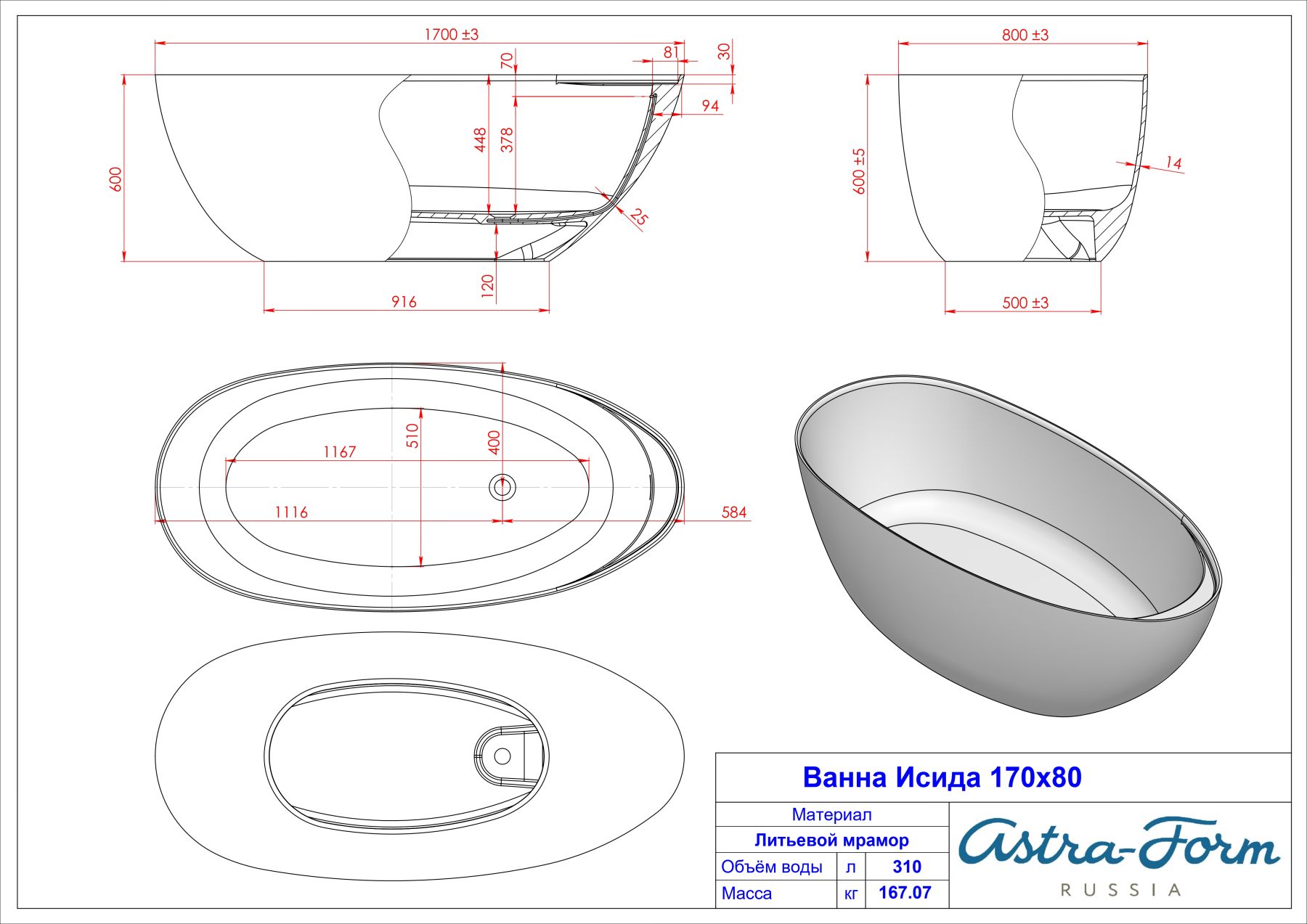 Ванна из искусственного камня Astra-Form Исида 01010049 170x80 см с интегрированным переливом белый глянец купить