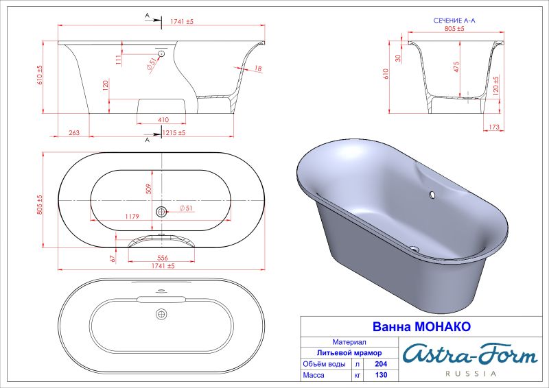 Ванна из искусственного камня Astra-Form Монако 01010030 174x80 см белый глянец купить