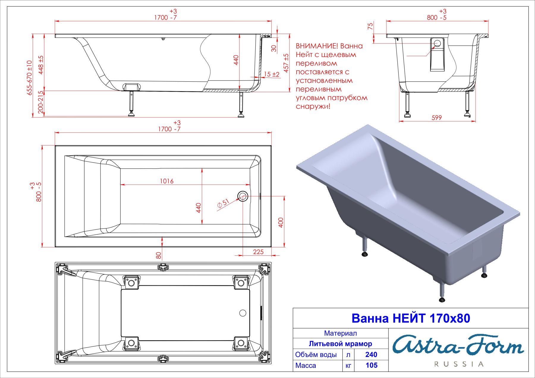 Ванна из искусственного камня Astra-Form Нейт 01010033+08010053 170x80 см с щелевым переливом донный клапан белый глянец