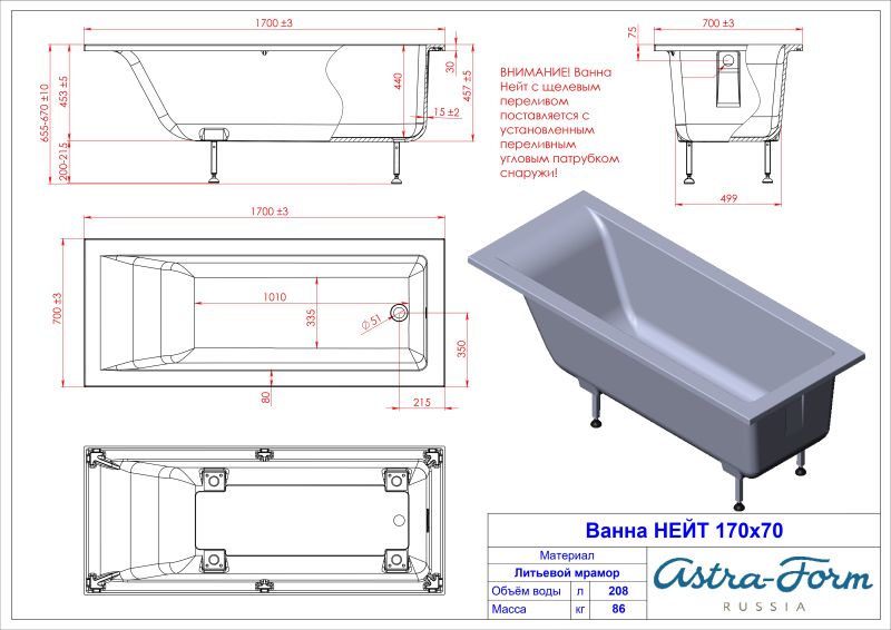 Ванна из искусственного камня Astra-Form Нейт 01010041+08010053 170x70 см с щелевым переливом донный клапан белый глянец