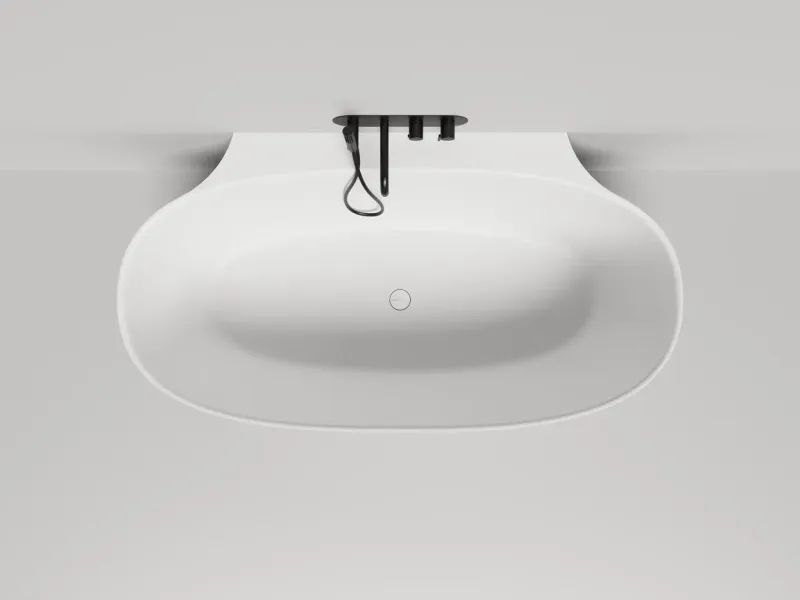 Эта модель соединяет в себе классическую овальную форму изголовий и спрятанный за ними пристенный борт. Благодаря такой конструкции создаётся впечатление отдельностоящей ванны, но сохраняется практичность плотного примыкания к стене и дополнительной поверхности для хранения косметических средств и аксессуаров. При желании здесь также можно разместить и смеситель. Более тонкая, детальная проработка формы чаши позволила уйти от классического понимания пристенной ванны с массивной боковой проекцией: блок, соприкасающийся со стеной, будто утоплен вдоль задней поверхности. Такова новая эстетика облегчённого дизайнерского решения Salini.