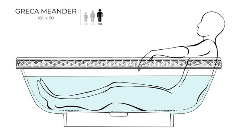Ванна предлагается в двух версиях — с гладким бортом и бортом, украшенным классическим древнегреческим орнаментом. Полоса орнамента «меандр» из материала S-Shine на основе эпоксидной смолы интегрирована в борт ванны, она прокрашивается в глубину любым цветом палитры RAL Classic. Такой орнамент не сотрётся со временем и никогда не выйдет из моды, как и сама модель классических пропорций.