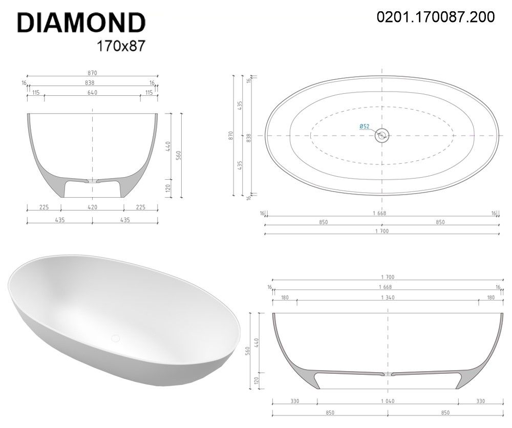 Ванна из искусственного камня Whitecross Diamond 0201.170087.200 170x87см белый матовый