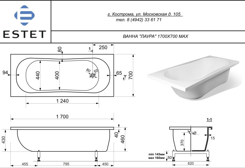Ванна из литьевого мрамора Эстет Лаура max ФР-00016844 170x70см белый купить