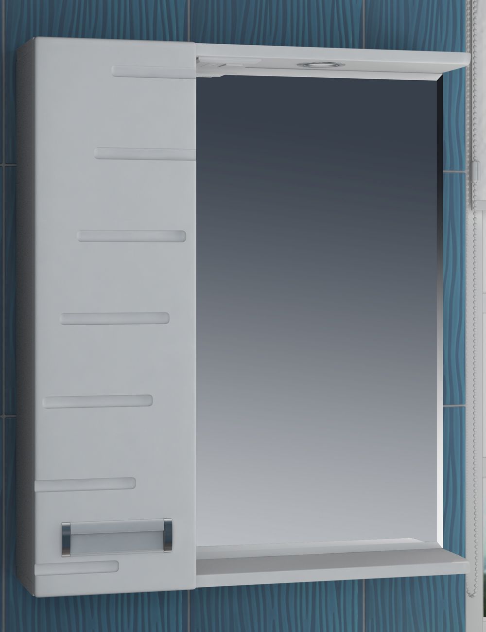 1 дверца; 2 полки ЛДСП, 1 светодиодный светильник, включатель с розеткой; ручка врезная металлическая хромированная.