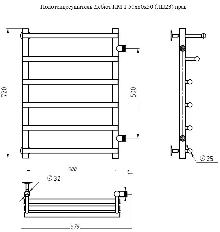 Водяной полотенцесушитель Тругор Дебют ПМ 1 50x80x50см правый хром Дебют1/ПМ508050прав