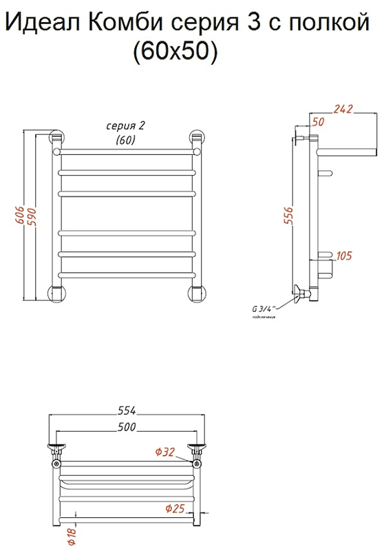 Водяной полотенцесушитель Тругор Идеал комби НП 3 П с полкой 60x50см хром Идеал/комби3/нп6050П