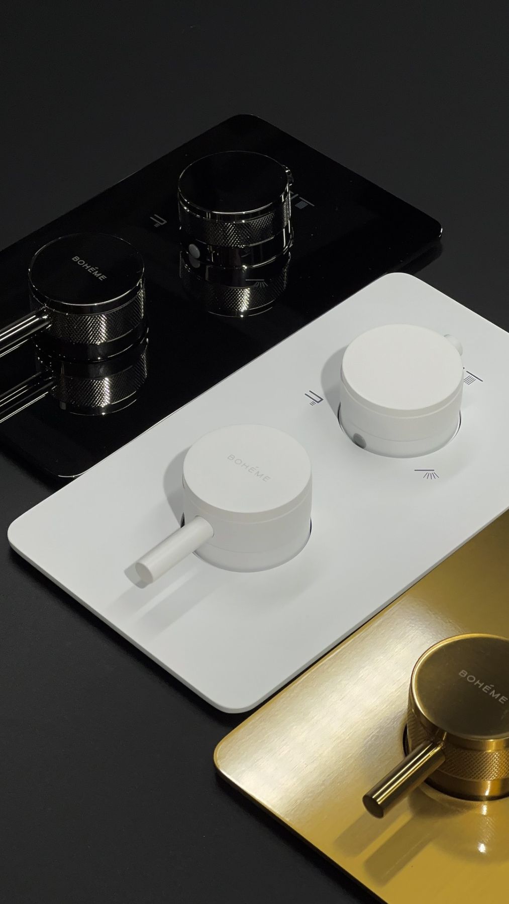 Новый встраиваемый смеситель для душа с термостатом Boheme CELL THERMO. Бокс для комфортного монтажа в стену. Термостат от мирового лидера, французского производителя Vernet. Версия на 2 выхода(верхний душ и ручная лейка) и версия на 3 выхода(верхний душ, ручная лейка и излив на выбор арт.625 и арт. 625/2). Идеально дополняется душевым набором Boheme CELL арт.427 с 2-х режимной верхней лейкой. 8 цветов в наличии.Смеситель для душа Boheme Cell 134-3-MW, термостатический, цвет белый матовыйХарактеристики: