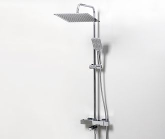 Душевая насадка 300х300 мм, 196 форсунок, нержавеющая стальСтойка для душа, Ø 22 мм регулируемая по высотеЛейка 3-функциональная с системой защиты от известковых отложенийШланг металлический 1500 мм, подключение к лейкеТермостатический смесительТермостатический картридж Vernet (Франция)Встроенный пластиковый аэратор Neoperl HONEYCOMB (Германия) с регулируемым углом наклона струиКерамический поворотный переключатель.Переключение потока воды смеситель/душ/лейка с помощью поворота изливаНабор для монтажа