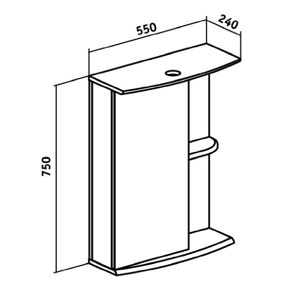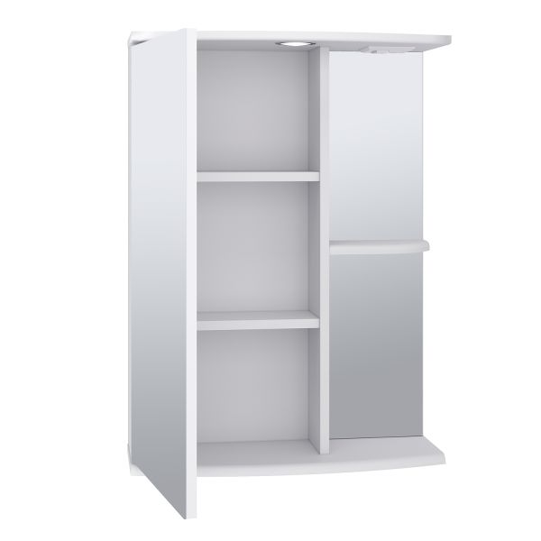 Зеркальный шкаф оборудован одним врезным светодиодным светильником 220В и розеткой с выключателем. Слева - шкаф с зеркальной дверцей и двумя внутренними полками, справа - открытая полочка. Петли со встроенным доводчиком. Выпускается только в левом исполнении.