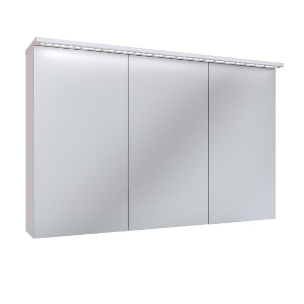 Зеркальный шкаф c тремя распашными зеркальными фасадами. Комплектуется светодиодной подсветкой, встроенной во врезной алюминиевый профиль, и розеткой с выключателем (внутри шкафа). Петли со встроенным доводчиком. Внутри каждого отделения шкафа по 2 встроенные полки.