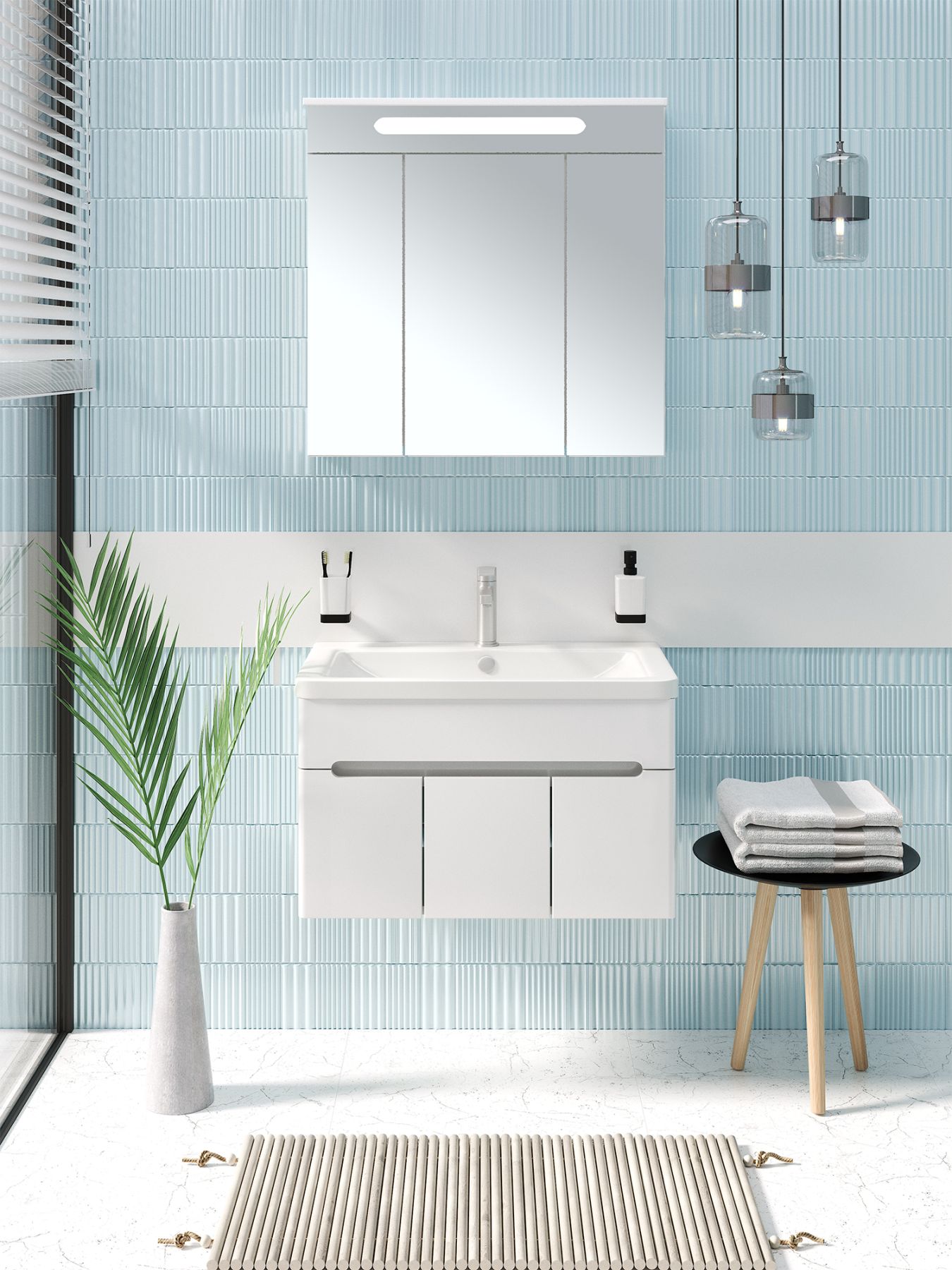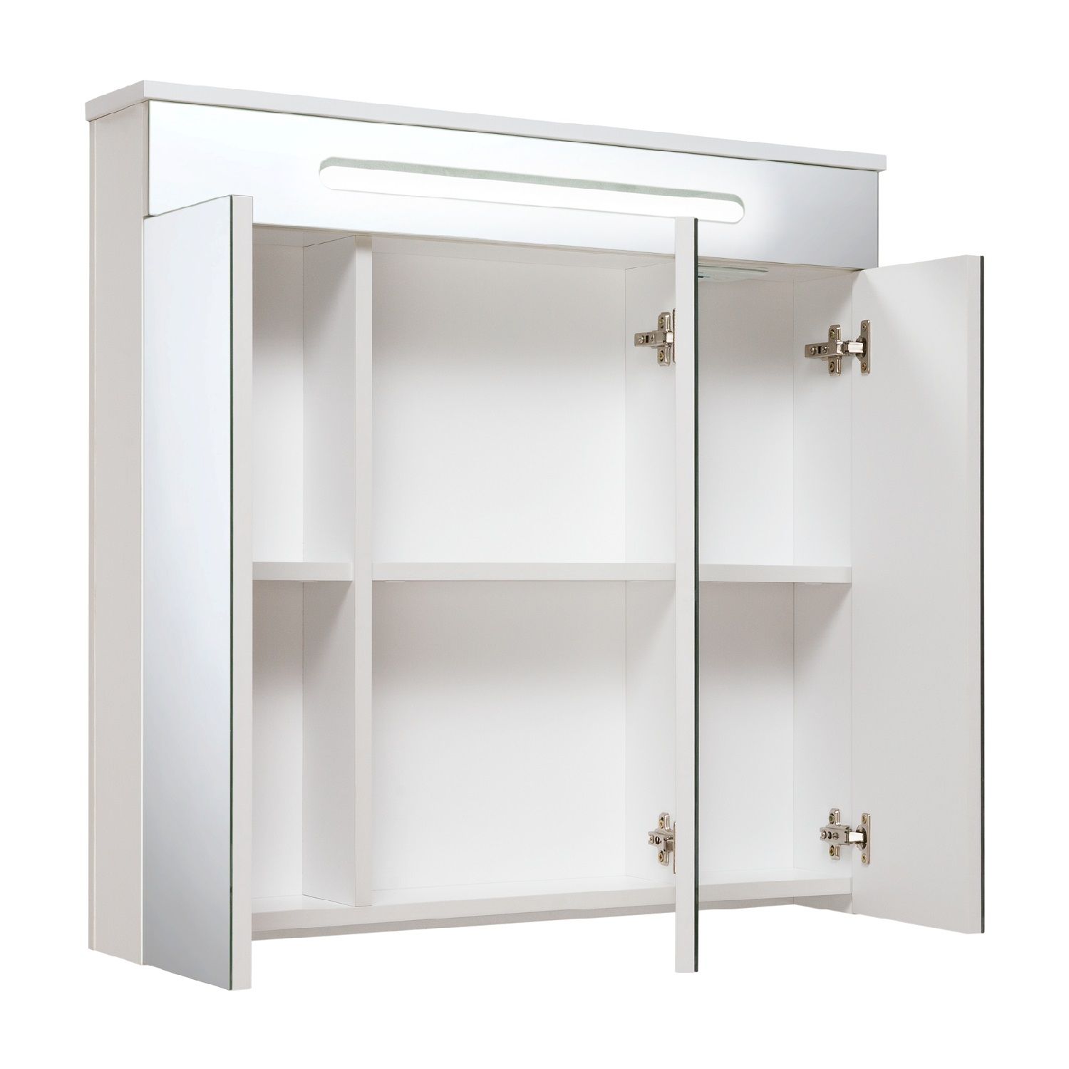 Зеркальный шкаф со встроенной сверху люминесцентной подсветкой и тремя отделениями с зеркальными фасадами. Внутри - две встроенные полки. Блок розетка/выключатель расположен внутри шкафа. Петли со встроенным доводчиком.