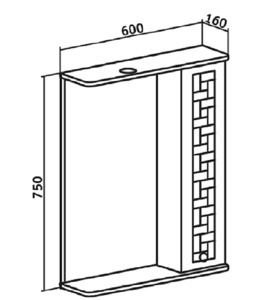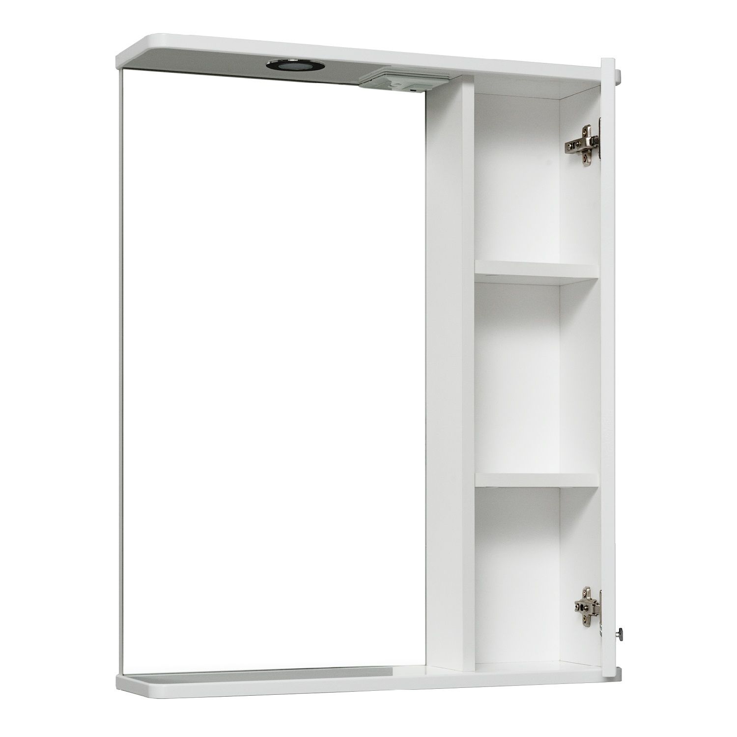 Зеркальный шкаф оборудован одним врезным светодиодным светильником 220В и розеткой с выключателем. Справа шкафчик с распашным фасадом, за которым две внутренние полки. Петли со встроенным доводчиком, ручка -1 шт. Выпускается только в правом исполнении.