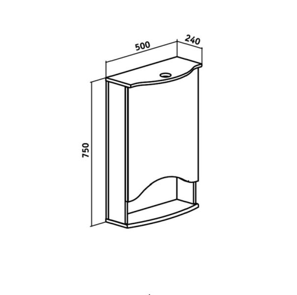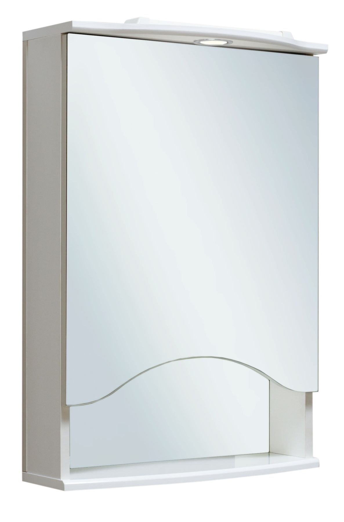 Зеркальный шкаф оборудован одним врезным светодиодным светильником 220В и розеткой с выключателем. Шкаф с распашной зеркальной дверкой и открытой нижней полкой. Внутри - две встроенные полки. Петли со встроенным доводчиком. Выпускается только в правом исполнении.