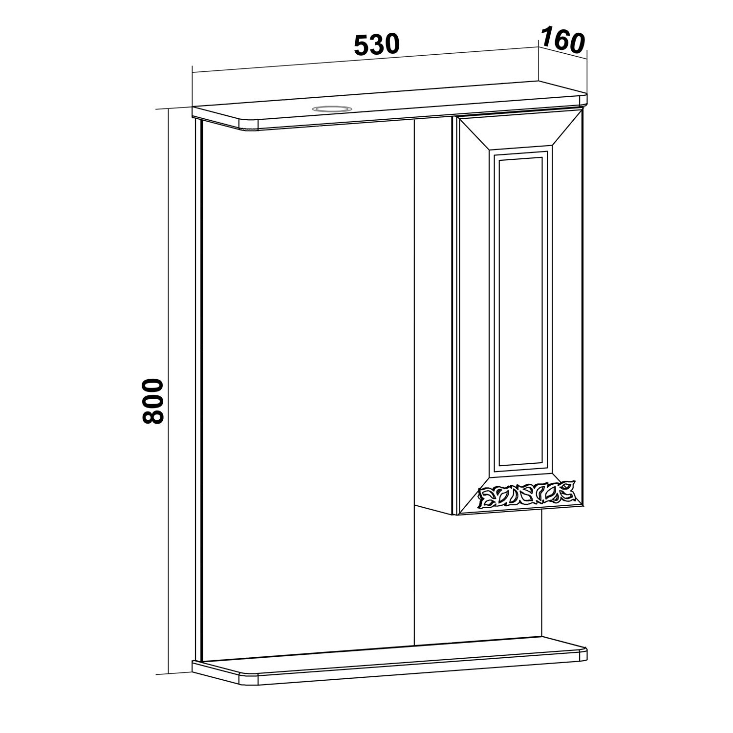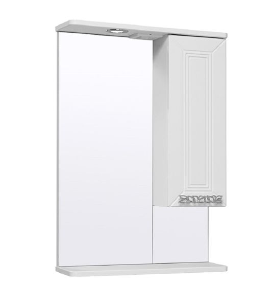 Зеркальный шкаф оборудован одним врезным светодиодным светильником 220В и розеткой с выключателем. Справа - шкафчик с распашной дверцей и одной внутренней полкой. Под зеркалом - нижняя полка. Петли со встроенным доводчиком, ручка - 1шт. Выпускается только в правом исполнении.