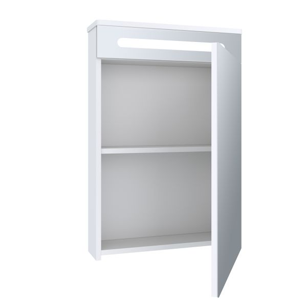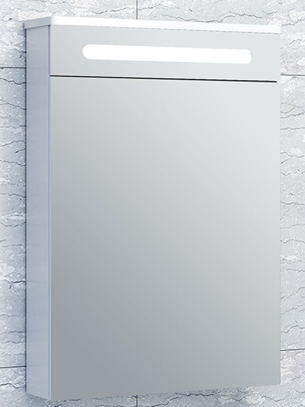 Зеркальный шкаф со встроенной сверху люминесцентной подсветкой и с распашной зеркальной дверкой. Блок розетка/выключатель расположен внутри шкафа. Петли со встроенным доводчиком. Выпускается только в правом исполнении.