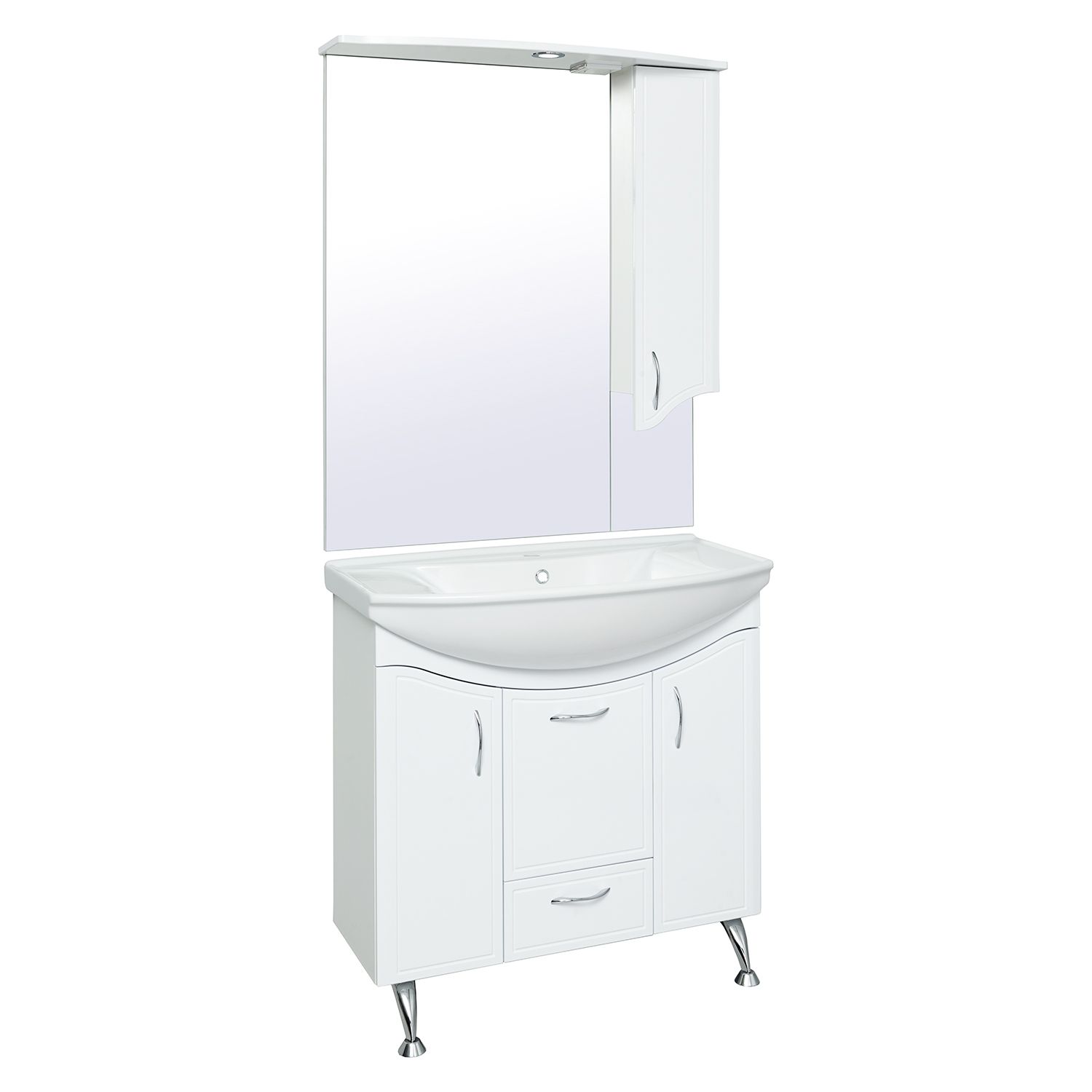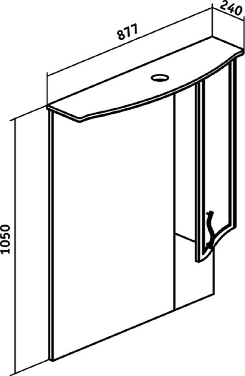 Зеркальный шкаф оборудован одним врезным светодиодным светильником 220В и розеткой с выключателем. Справа - шкафчик с распашным фасадом и двумя внутренними полками. Петли со встроенным доводчиком, ручка - 1шт. Выпускается только в правом исполнении.