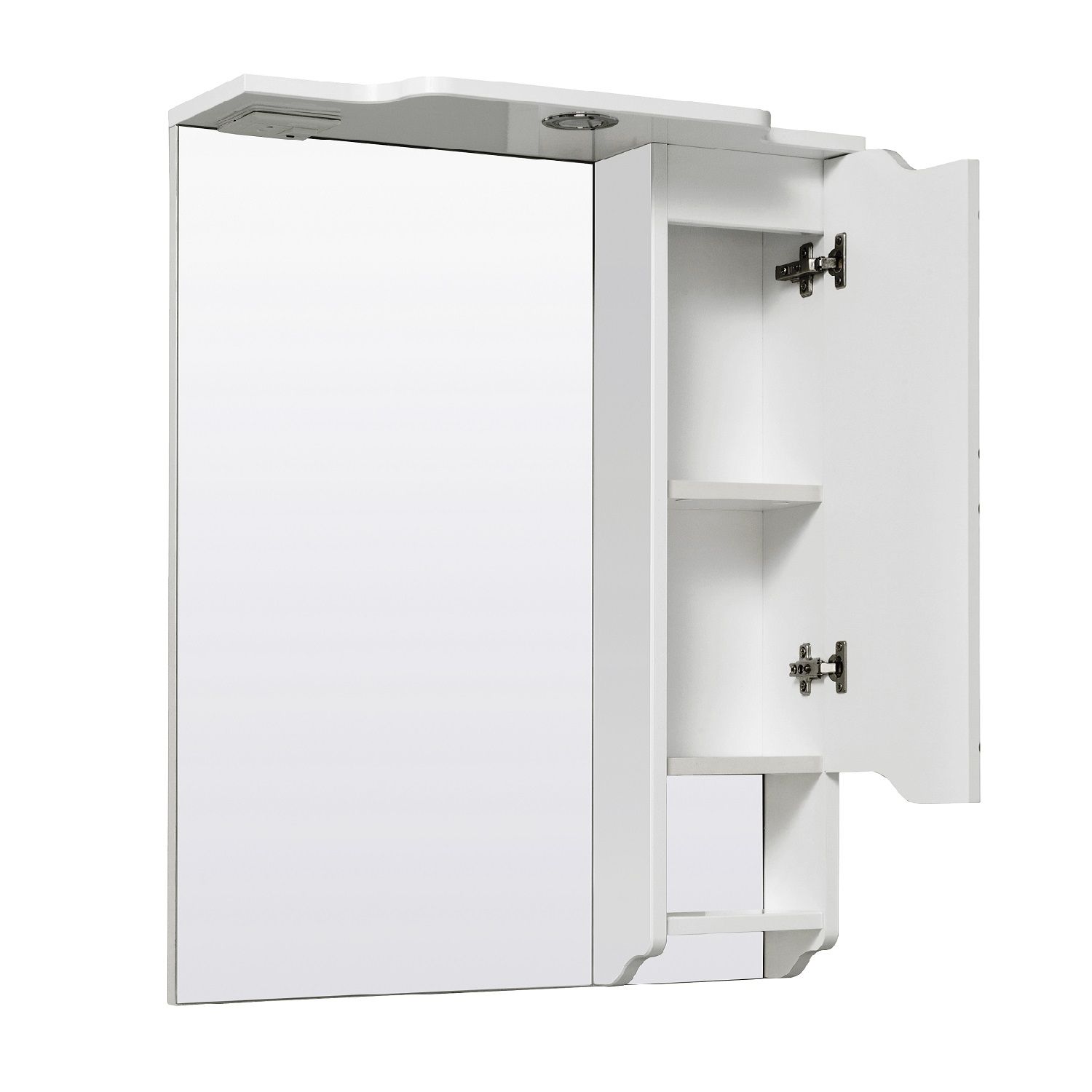 Зеркальный шкаф оборудован одним врезным светодиодным светильником 220В и розеткой с выключателем. Справа - шкафчик с распашной дверцей и одной внутренней полкой. Под шкафом - открытая полочка. Петли со встроенным доводчиком. Выпускается только в правом исполнении.