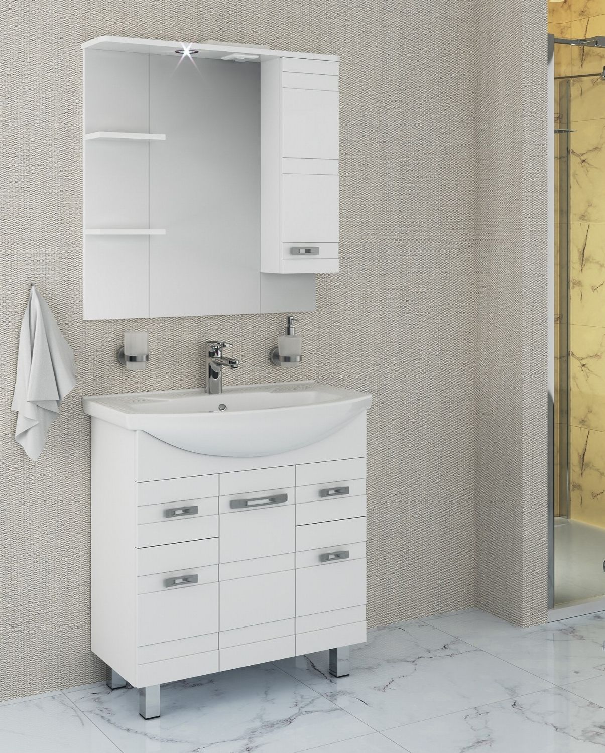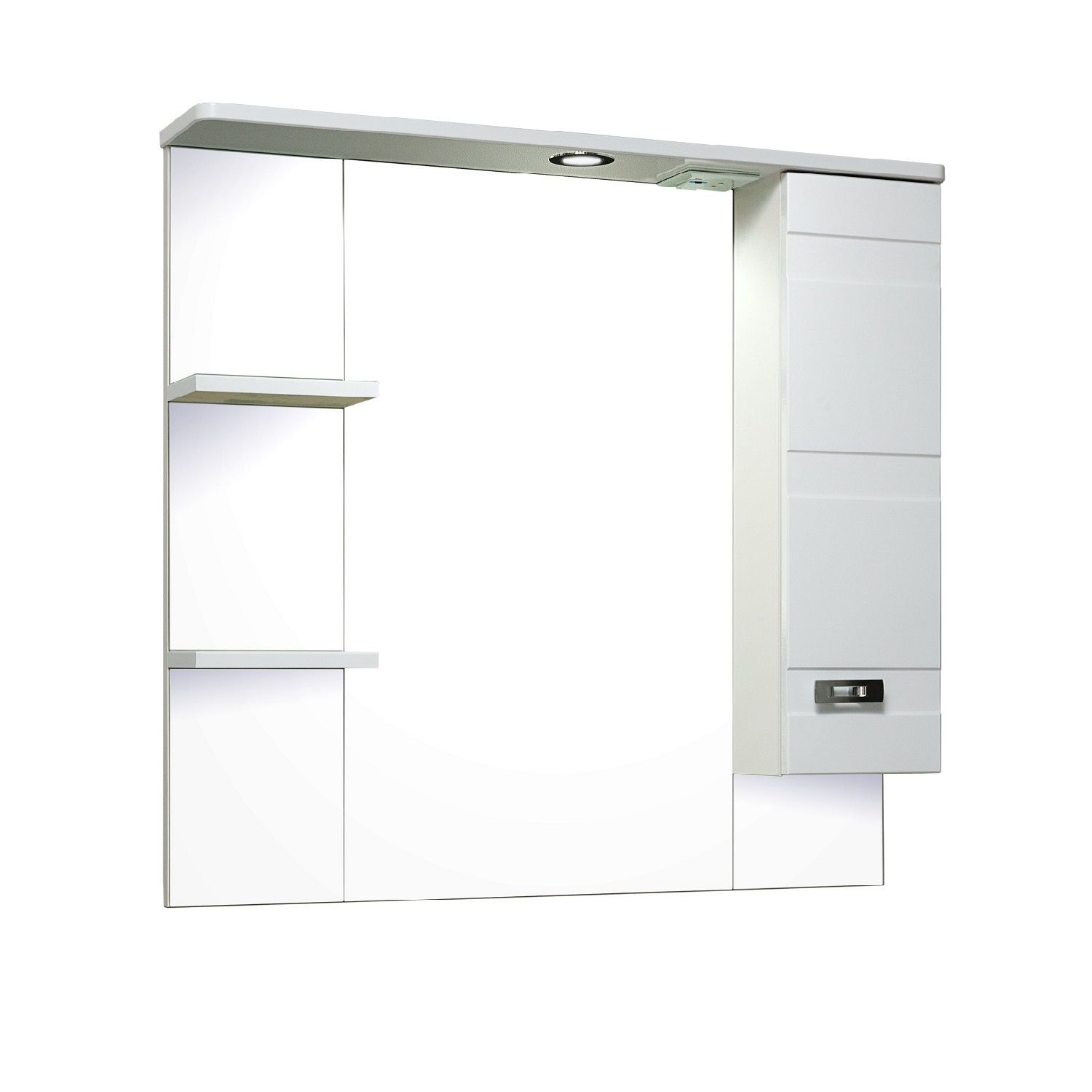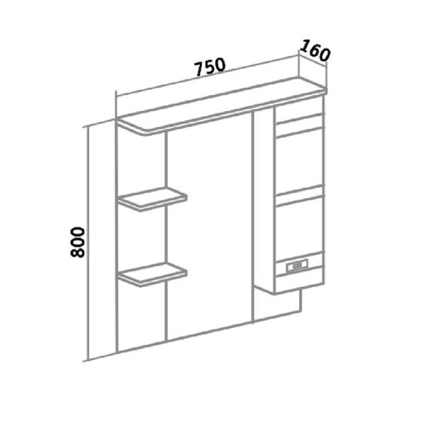Зеркальный шкаф оборудован одним врезным светодиодным светильником 220В и розеткой с выключателем. Справа - шкафчик с распашной дверцей и одной внутренней полкой. Слева - две открытые полочки. Петли со встроенным доводчиком, ручка - 1шт. Выпускается только в правом исполнении.