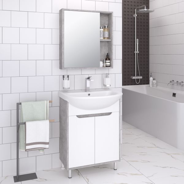 Зеркальный шкаф для ванной RUNO ЭКО - превосходное решение для современного оснащения ванной комнаты. Зеркало для ванной ЭКО - это стильное сочетание текстуры серого необработанного бетона на корпусе из МДФ. Шкафчик в ванную имеет одну распашную дверцу с зеркальным фасадом и две открытые полки. Шкаф в ванную - универсальный (для смены ориентации изделие поворачивается на 180 градусов). Внутри шкафа - одна внутренняя полка. Мебель для ванной RUNO - красота и практичность в мелочах!