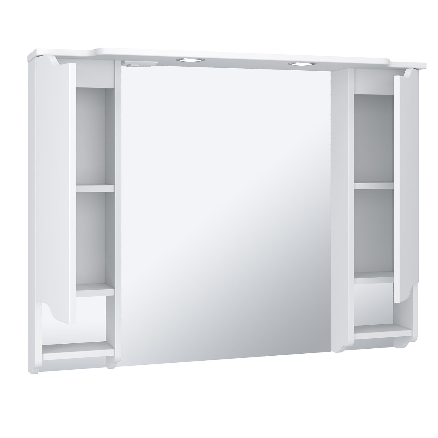 Зеркальный шкаф оборудован двумя врезными светодиодными светильниками 220В и розеткой с выключателем. Справа и слева - шкафчики с распашными дверками и одной внутренней полкой в каждом. Под шкафчиками - открытые полочки. Петли со встроенным доводчиком.