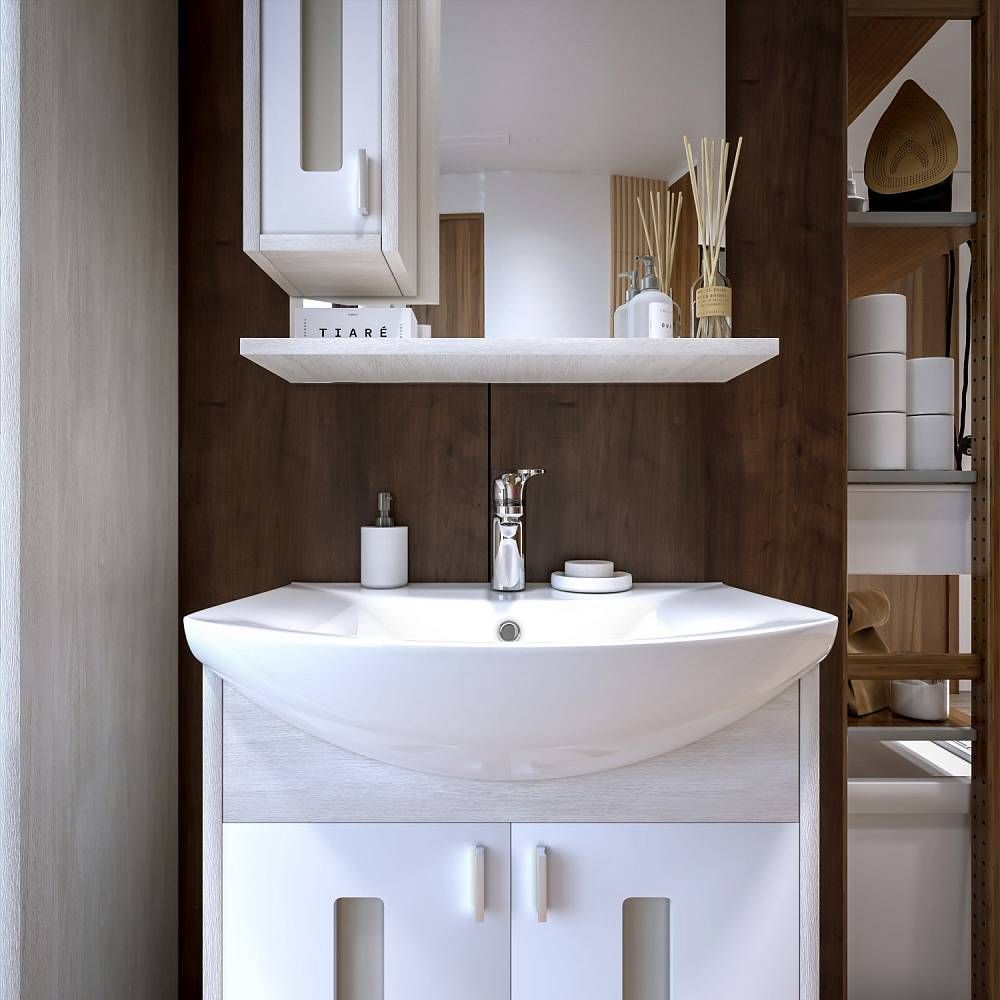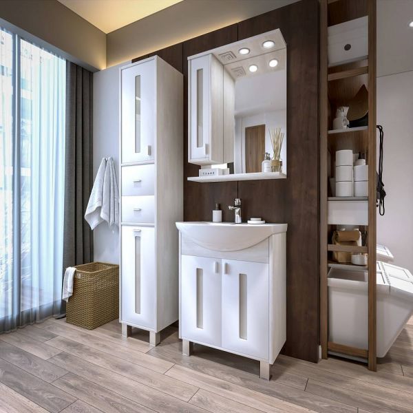 Внутреннее содержание шкафа умело организовано: разнообразные полки и отсеки позволяют удобно разместить все необходимые аксессуары – от косметики до бытовой химии. Зеркало, интегрированное в фасад, визуально расширяет пространство и облегчает утренние рутинные процедуры.