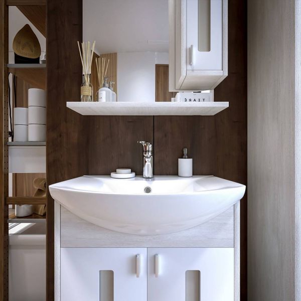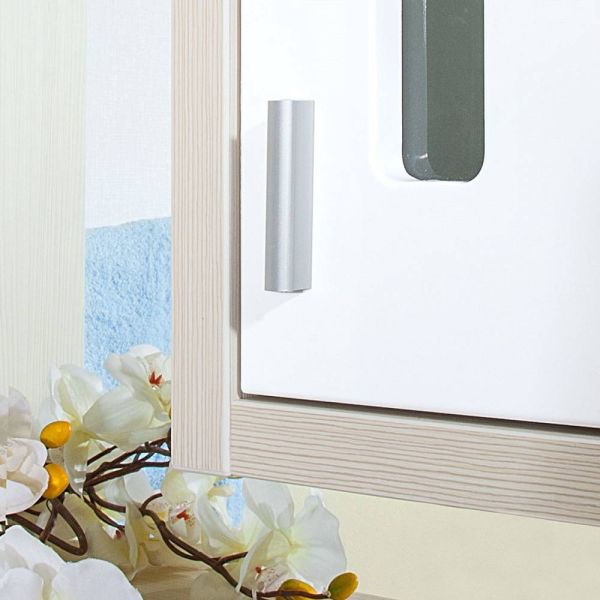 Внутреннее содержание шкафа умело организовано: разнообразные полки и отсеки позволяют удобно разместить все необходимые аксессуары – от косметики до бытовой химии. Зеркало, интегрированное в фасад, визуально расширяет пространство и облегчает утренние рутинные процедуры.