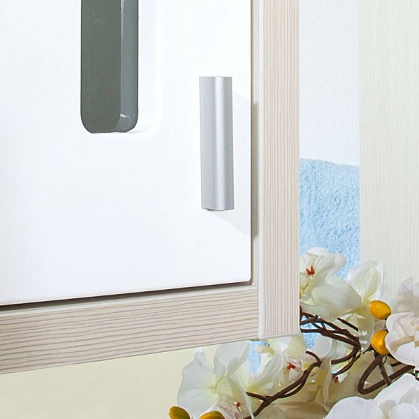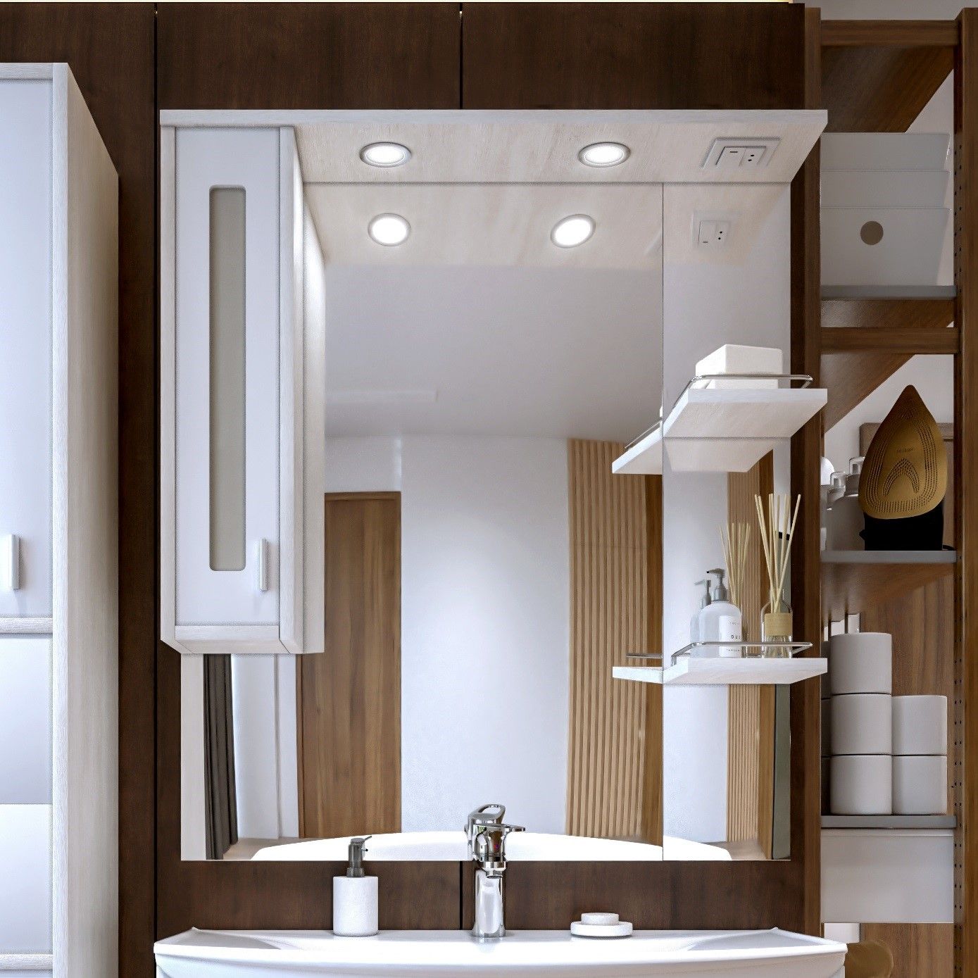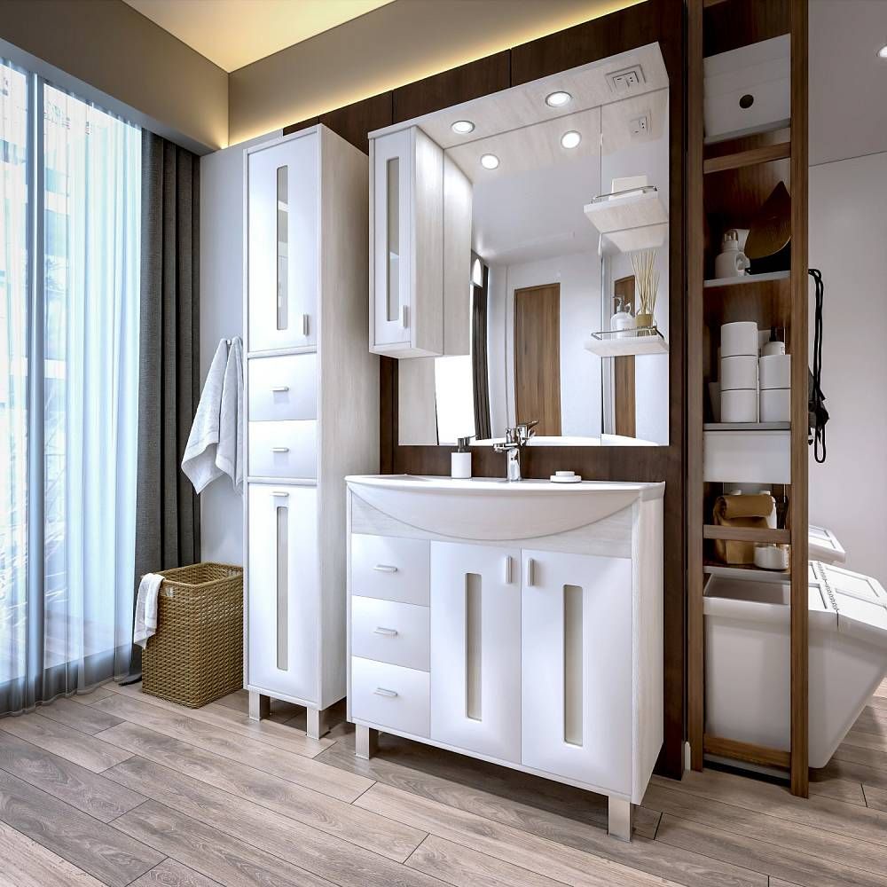 Внутреннее содержание шкафа умело организовано: разнообразные полки и отсеки позволяют удобно разместить все необходимые аксессуары – от косметики до бытовой химии. Зеркало, интегрированное в фасад, визуально расширяет пространство и облегчает утренние рутинные процедуры.