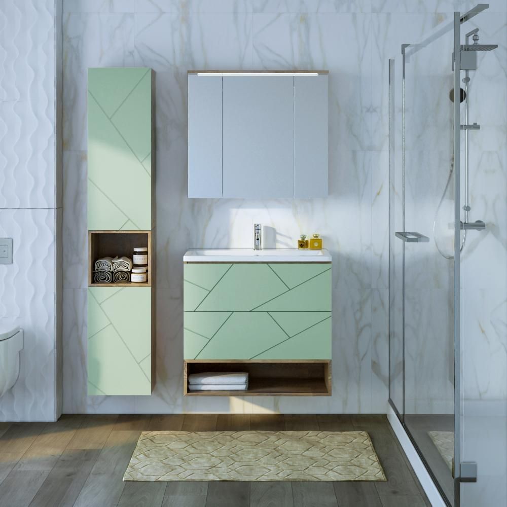 Внутреннее содержание шкафа умело организовано: разнообразные полки и отсеки позволяют удобно разместить все необходимые аксессуары – от косметики до бытовой химии. Зеркало, интегрированное в фасад, визуально расширяет пространство и облегчает утренние рутинные процедуры.