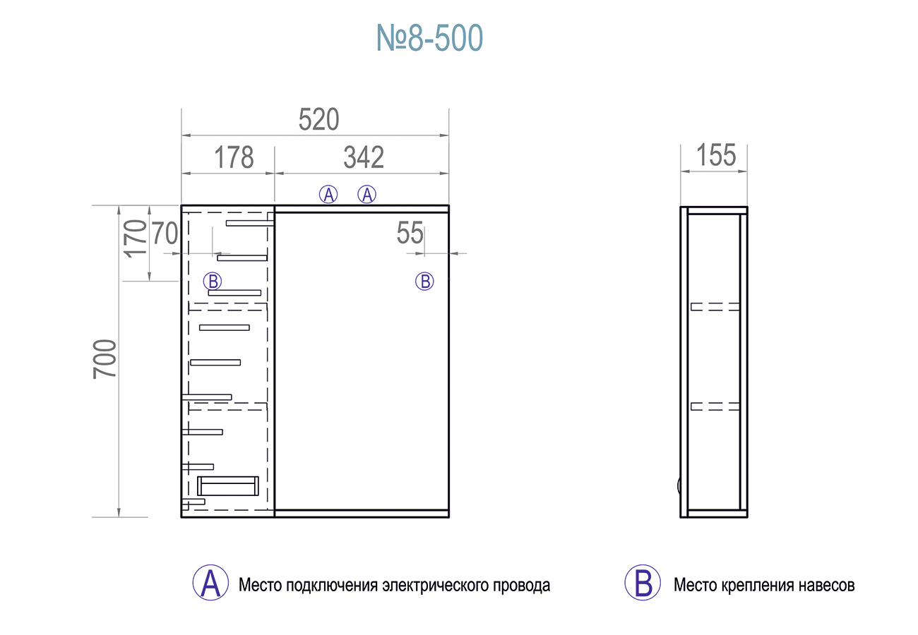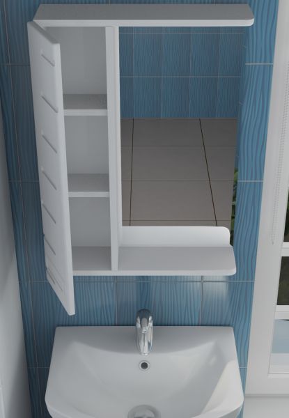 1 дверца; 2 полки ЛДСП, 1 светодиодный светильник, включатель с розеткой; ручка врезная металлическая хромированная.