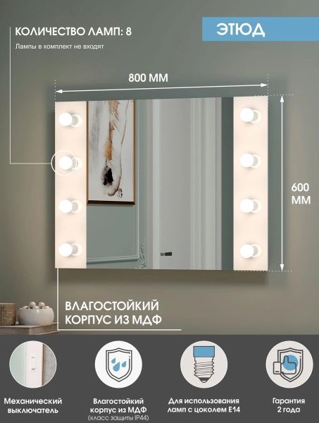 Гримерное Этюд встроенными Led лампами (8 ламп) 800х600LED подсветкафункция изменения теплоты подсветки (холодная/нейтральная/теплая)механический выключатель
