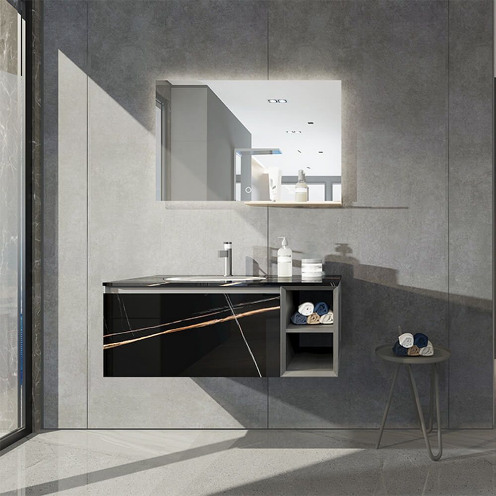 В коллекцию входят 4 комплекта, составленные из навесного шкафа под раковину, раковины и сенсорного зеркала с металлической полочкой под косметические средства. В качестве материала изготовления шкафа использован высококачественный МДФ и белый ясень, а также выполнена облицовка из светлого и темного утонченного керамогранита.Цвет RB 004