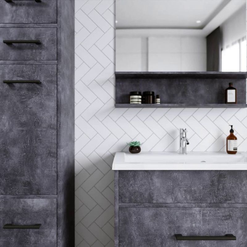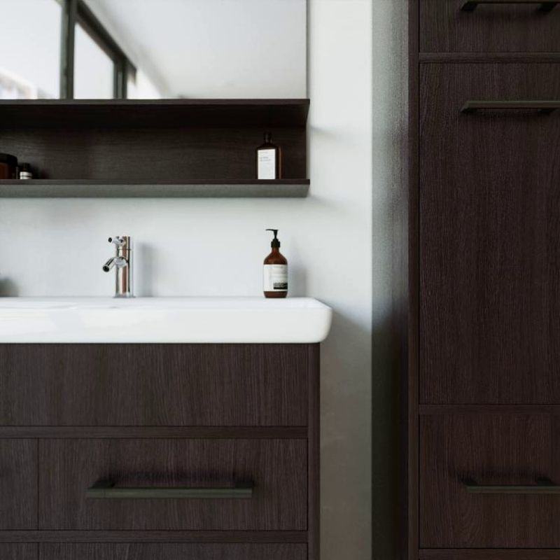 Его чистые линии и сдержанная форма создают гармоничный контраст с отделкой стен и сантехникой, добавляя комнате ощущение простоты и элегантности.