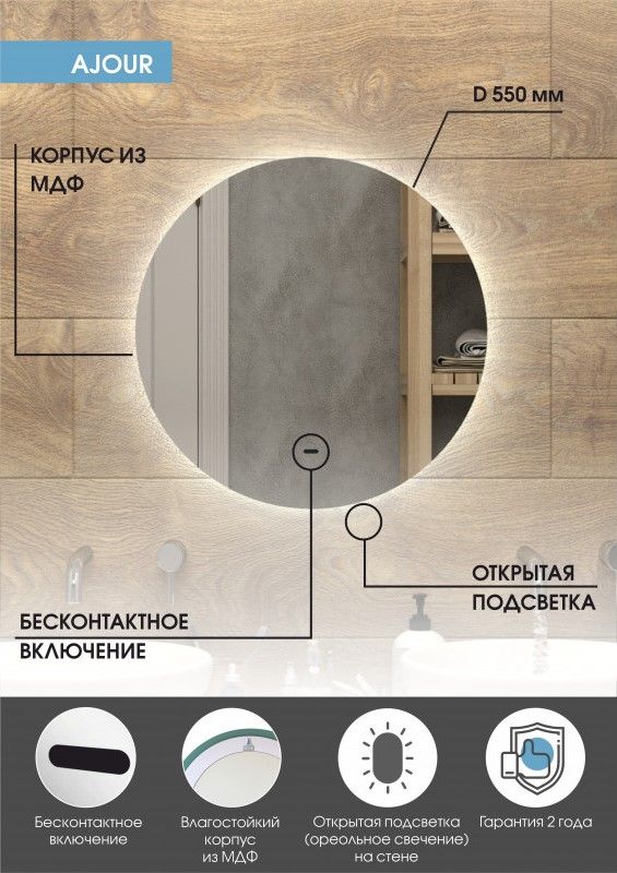 Зеркало "Ajour" D 550 с бесконтактным сенсоромLED подсветка 6000Кбесконтактный сенсор с функцией димированияореольная подсветка