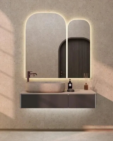 Арочные зеркала VETRATA R представлены в размерах 40×103.5 и 72×115.5 см. Каждое зеркало имеет три режима интерьерной подсветки: её температуру можно менять бесконтактно, простым взмахом руки. Зеркала оснащены диммером, регулирующим интенсивность свечения, и функцией антизапотевание. В интерьере более узкое и более широкое зеркала можно расположить рядом: особенно стильно это смотрится в сочетании с тумбой шириной 120 см. Также зеркала можно использовать по отдельности.
