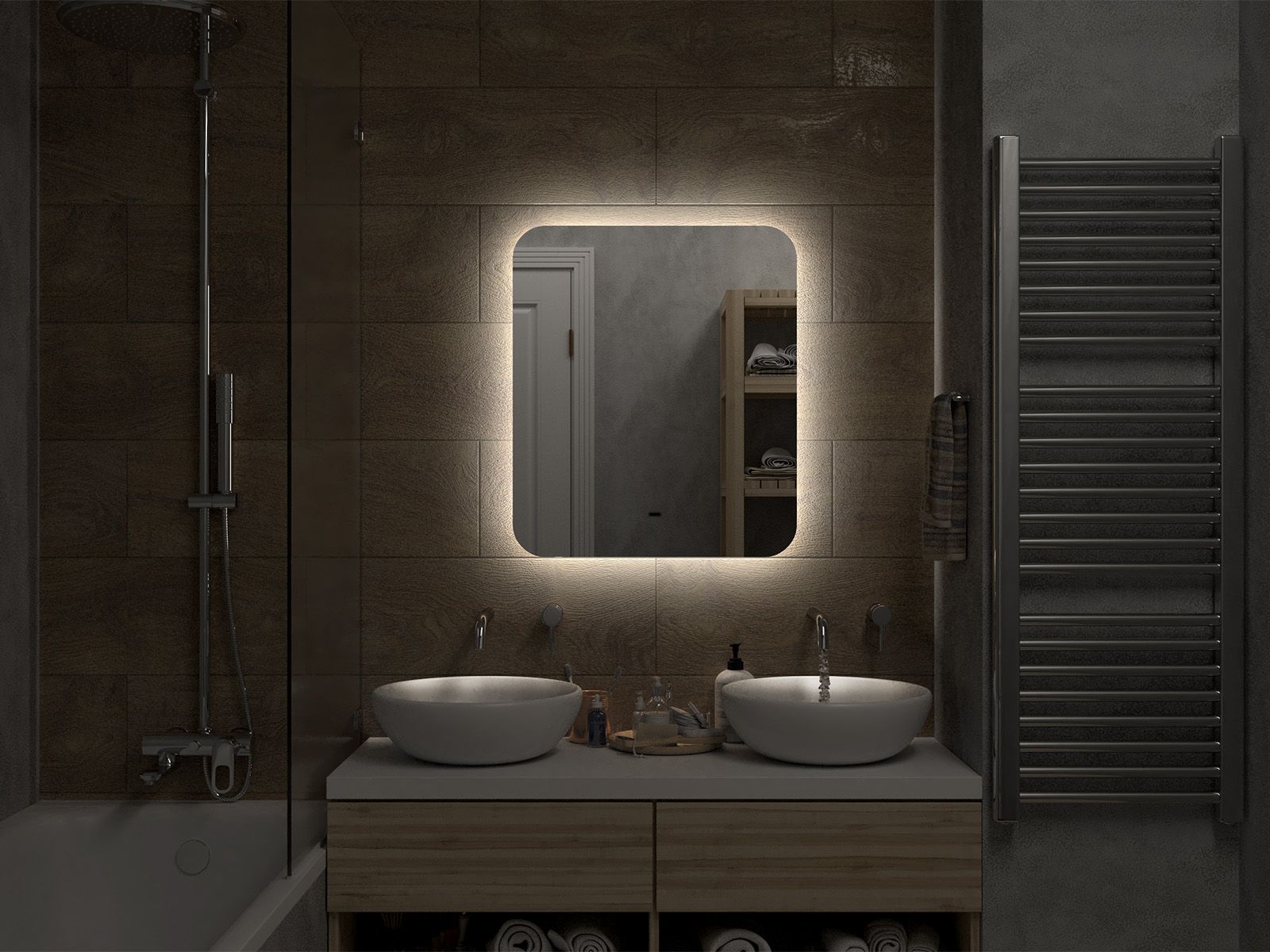 Зеркало с подсветкой для ванной комнаты — это элемент интерьера, который сочетает в себе функции, эстетику и современный дизайн. Его изящная форма и тонкие линии легко вливаются в любое пространство, создавая атмосферу утонченности и уюта.Интегрированная светодиодная подсветка обрамляет зеркало, даря мягкий, рассеянный свет, который не только позволяет удобно наносить макияж, но и наполняет ванную комнату теплом и позитивной энергией.Классический дизайн позволяет использовать его в различных стилях – от минимализма до современного эклектичного оформления. Оно прекрасно вписывается в любую цветовую гамму, будь то нейтральные тона или более яркие акценты.