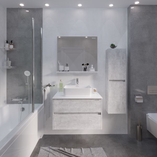 Зеркало Эдванс 80 см с полкой отражает современные тенденции в дизайне мебели для ванных комнат: и создано для тех, кто ценит современный лаконичный дизайн, холодный эффект светлого цемента.