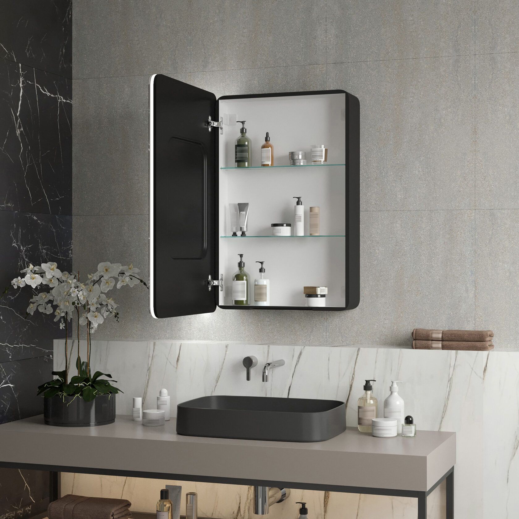 Представляем Зеркальный шкаф для ванной комнаты с контурной LED подсветкой Reflection Black 560х850 RF2001BL.