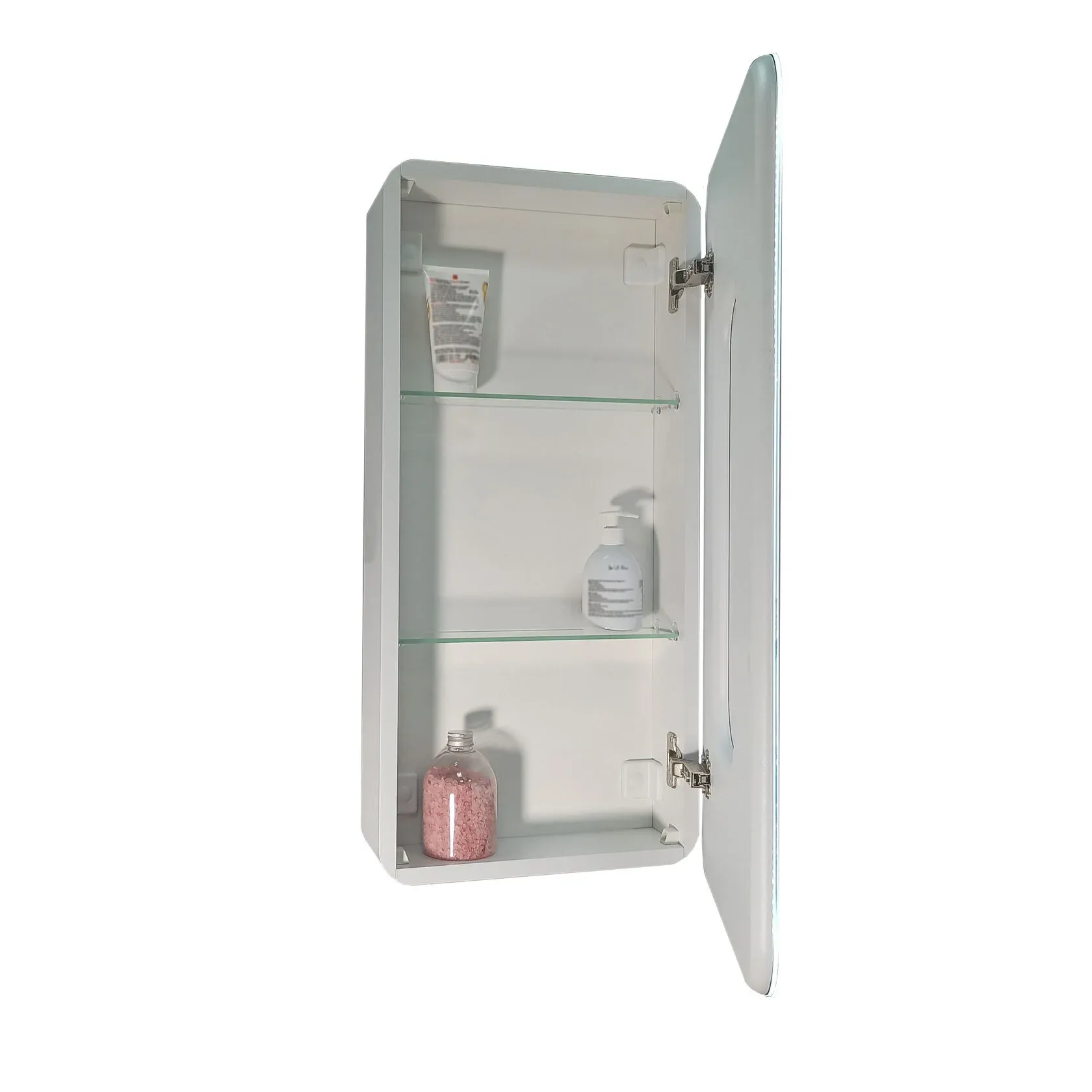 Стеклянные полки легко регулируются по высоте. Хромированные крепления не ржавеют при длительной эксплуатации в условиях повышенной влажности. Защита по стандарту IP44 обеспечивает безопасное использование устройства в условиях повышенной влажности.