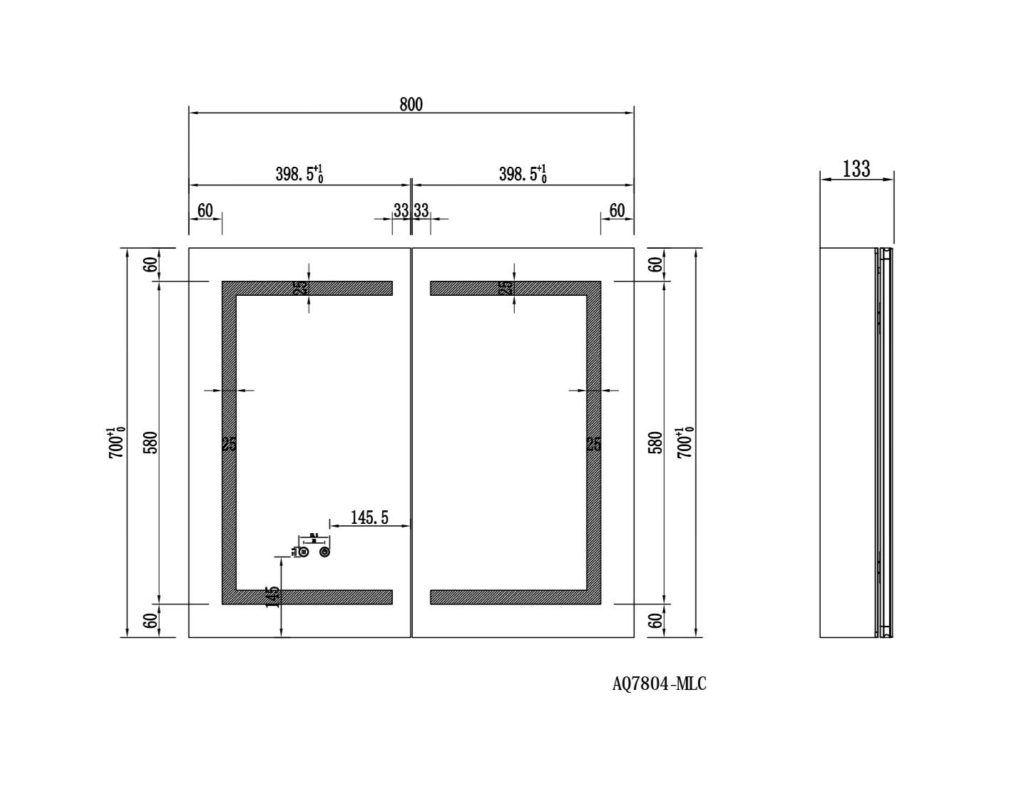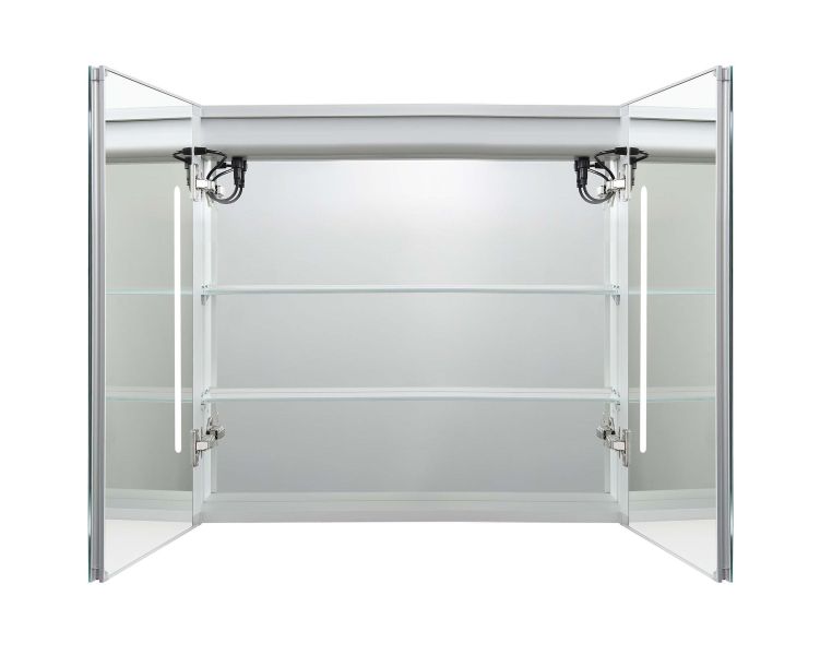 Габариты (Д В Ш), мм: 800*700*133Алюминиевый зеркальный шкаф с подсветкойФорма: прямоугольнаяМонтаж: подвесной, монтируется на поверхность или в нишуДве зеркальные дверцы шириной 39,85см. Двусторонние зеркальные двери и зеркальные боковиныДве стеклянные полки 8 мм.Материал: алюминийЦвет: хромЗеркальный салонКруговая подсветка SMD 2835-120P, цветовая температура 2500K/6500KФункция антизапотевания2 режима переключения света/ цветаСенсорное управлениеС механизмом доводчика, обеспечивающим плавное закрываниеМебель поставляется в собранном видеДополнительное оснащение зеркала: подвесыГарантия: 1 год