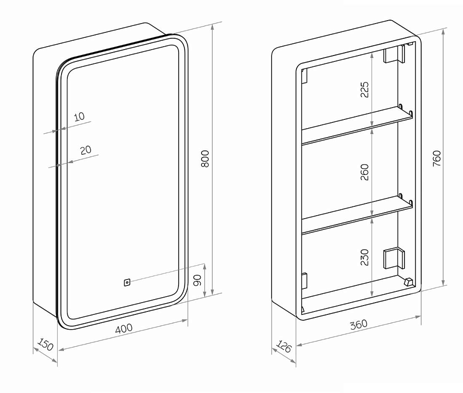 Зеркало-шкаф "Elliott LED" 400х800 правый с розеткойLED подсветка 6000К; сенсорный включатель с функцией димирования, Материал корпуса- МДФ, пленка ПВХ, розетка