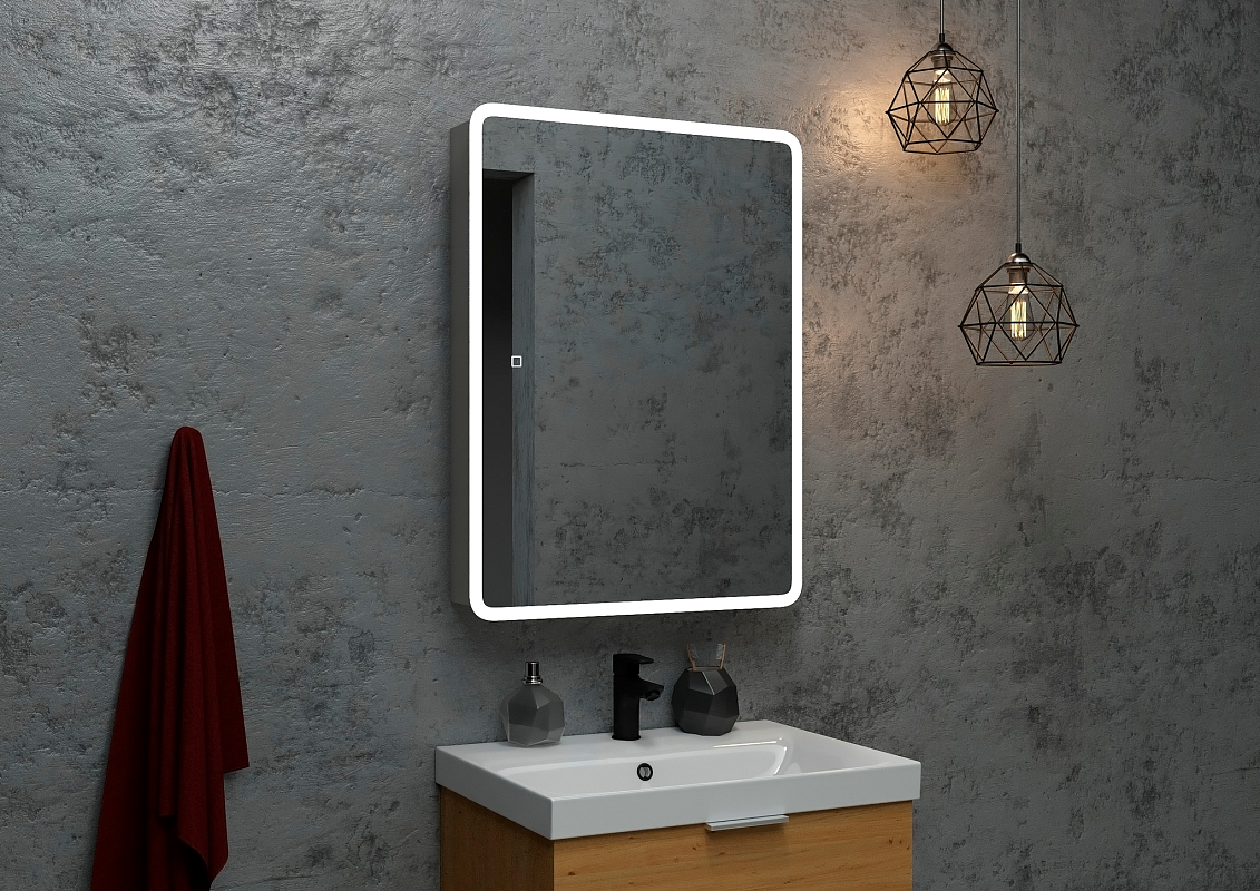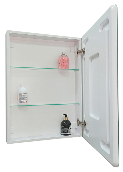 Зеркало-шкаф "Emotion LED" 500х800LED подсветка 6000К; сенсорное включение справа по центру, реверсивные крепления, пластиковый короб, прямые углы на коробе и радиусные на зеркале, полка/2 шт, без розетки, петли Firmax